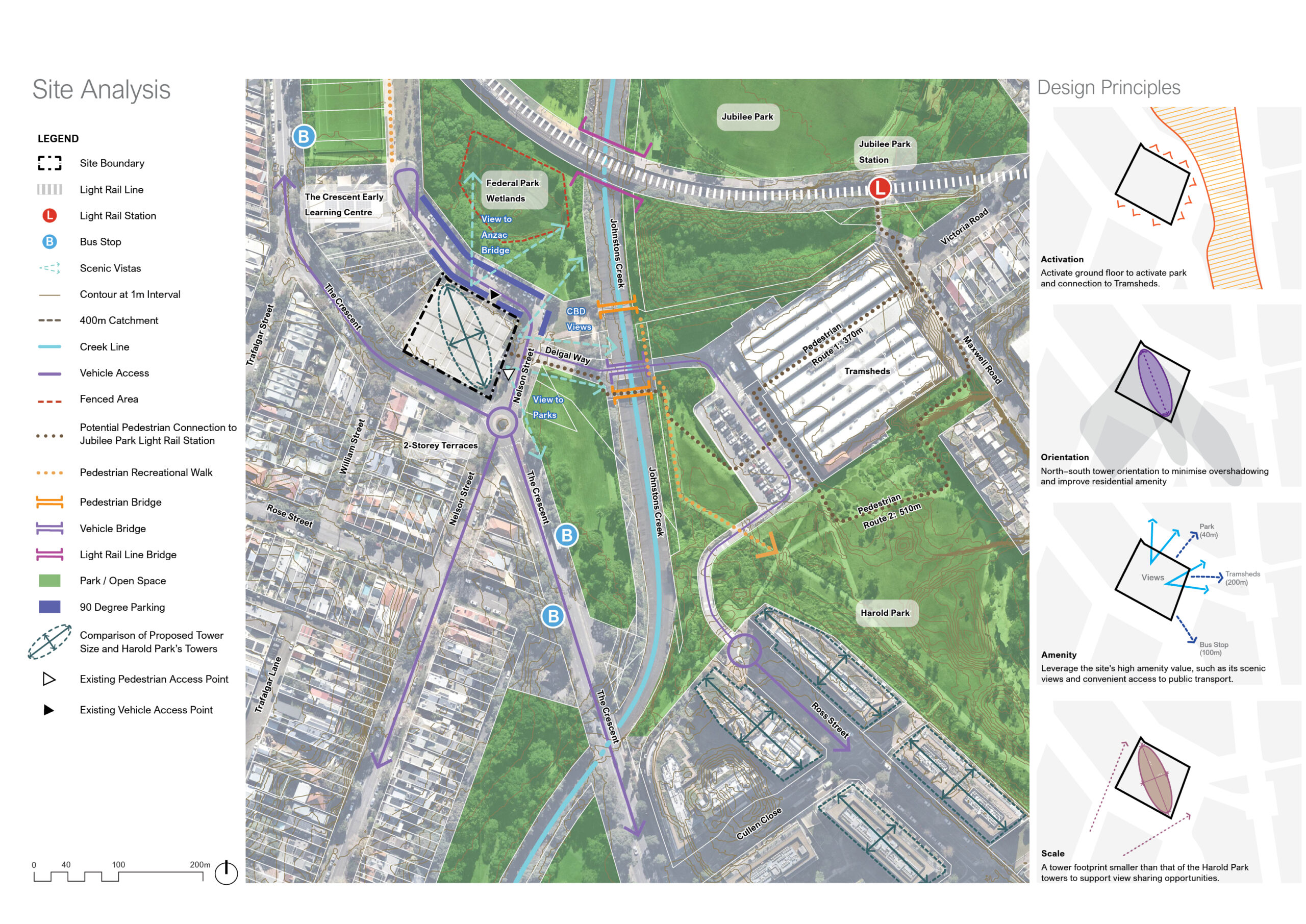 ADW Johnson was engaged by Webber’s Carpet Warehouse to undertake a built form study to investigate the development potential for a 2,400m2 site surrounded by parkland in Annandale. This investigation was triggered by planning pathways available under the Housing Delivery Authority.